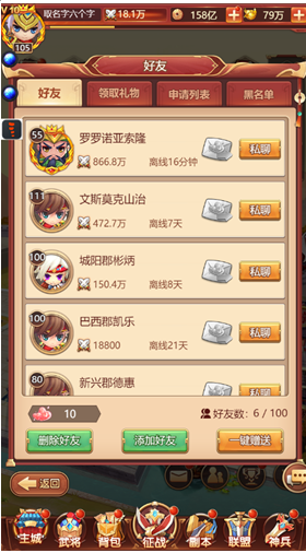 1、好友功能是玩家之间交流互动的系统,包括好友列表、互赠礼物、黑名单等功能,同时好友能提供武将援助。