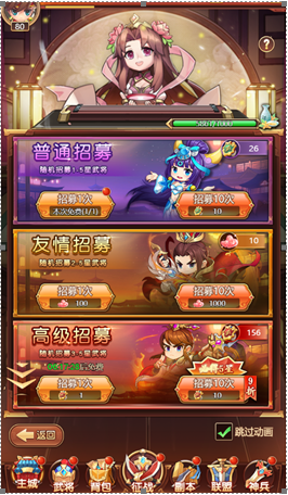 招将类型有4种:普通招募、友情招募、高级招募、积分招募