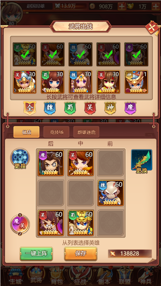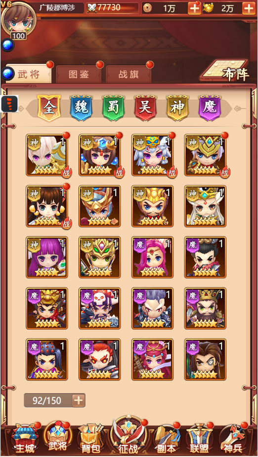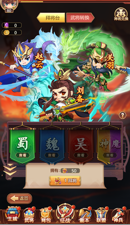 2、武将分为魏蜀吴神魔共计5个阵营,各阵营之间存在着相对应的克制关系。
