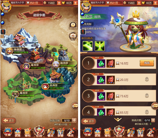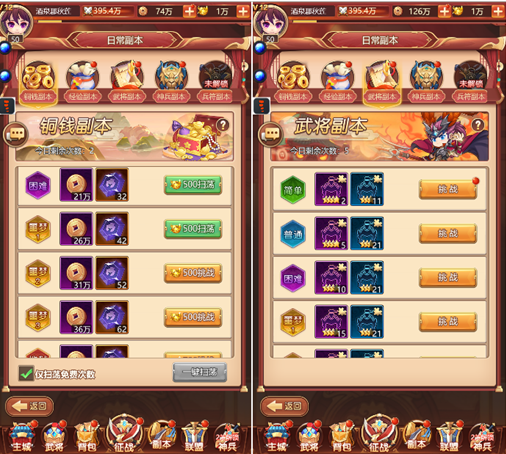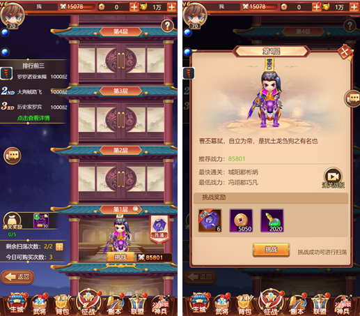 1、本玩法为游戏的核心主线玩法,玩家在此玩法中可逐步挑战敌将来获得游戏各种基础资源,并获得更高的挂机奖励。