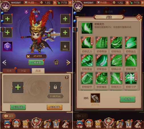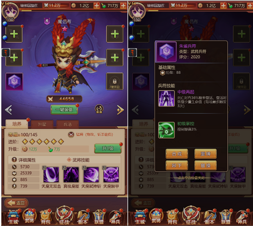 5、武将可进行多种手段养成,例如升级、进阶、升星、着装、兵法技等。