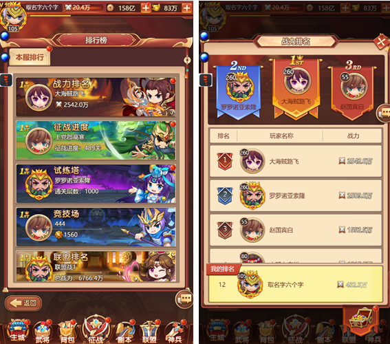 3、5种排行榜分别跟据玩家的总战力、征战进度、通关楼层、竞技场积分和联盟等级进行排名。