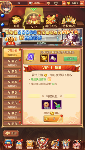 a.玩家累计充值可激活VIP,获取游戏特权。