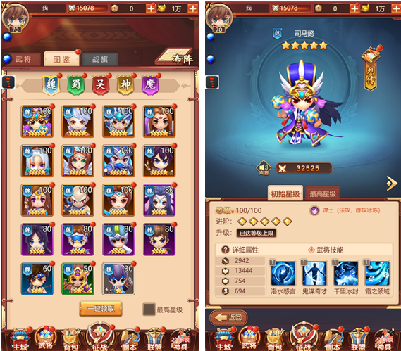 3、武将的养成中,星级的养成是核心要点。能升级到13星的武将是游戏中后期的核心养成要点,记得通过图鉴来了解哪些武将能升级到13星。