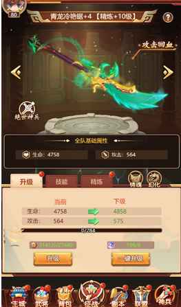 3、神兵也能升级和精炼,还有技能效果,等级越高,属性加成和战斗伤害也就越高,但需要5把神兵都解锁后才能养成。