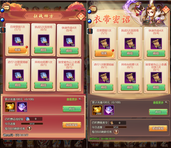 2、每日任务每天0点刷新。