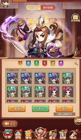 1、一般是武将背包满了,需要清掉一些没用的武将时的一个好功能,遣散了还能获得武将精魄,此道具积攒起来还可以去武将商城兑换武将。