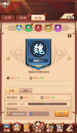 b. 进阶:进阶除了提升基础属性,还能提升等级上限,加成升级获得的基础属性,还可解锁武将技能;