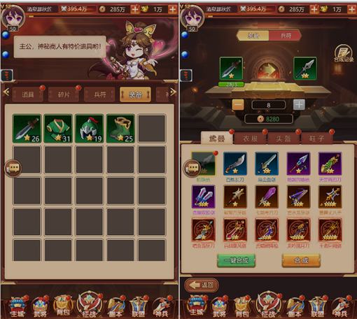 4、神兵的附加功能:铸魂,铸魂的等级越高,加成的属性值也越高,但铸魂的材料比较稀有,充值购买活动礼包能获得,主公们不必特意去培养。