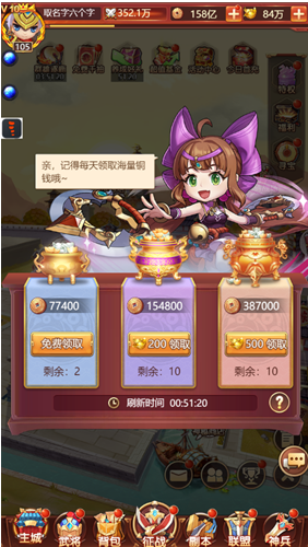 7、注意每天上线收集各种资源与免费福利,这样能大大加速自己的武将养成!