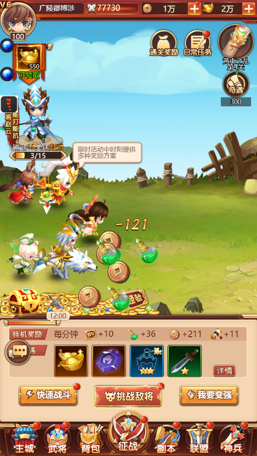 6、玩家还可以进行快速战斗,每次快速战斗可直接获得120分钟的挂机收益。每天快速战斗次数会有上限;