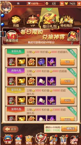 2、每日礼包尽量一键购买,一键购买会有优惠;